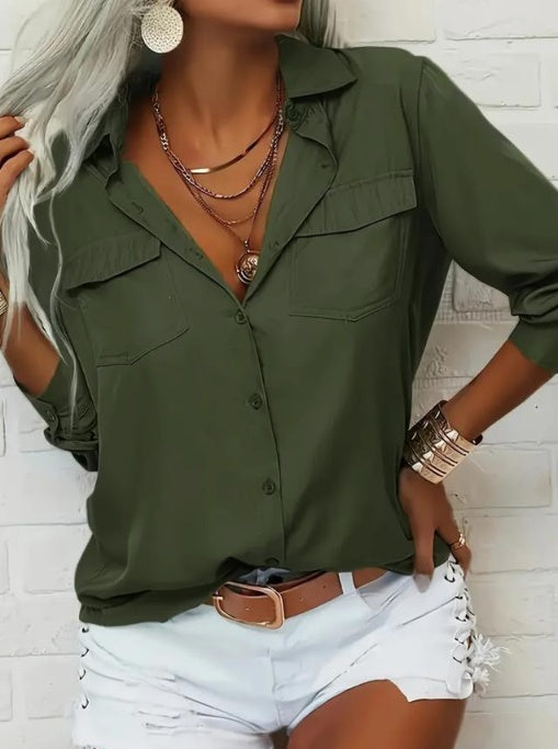 Ladies' Solid Color V-neck Lapel Pocket Casual Shirt
