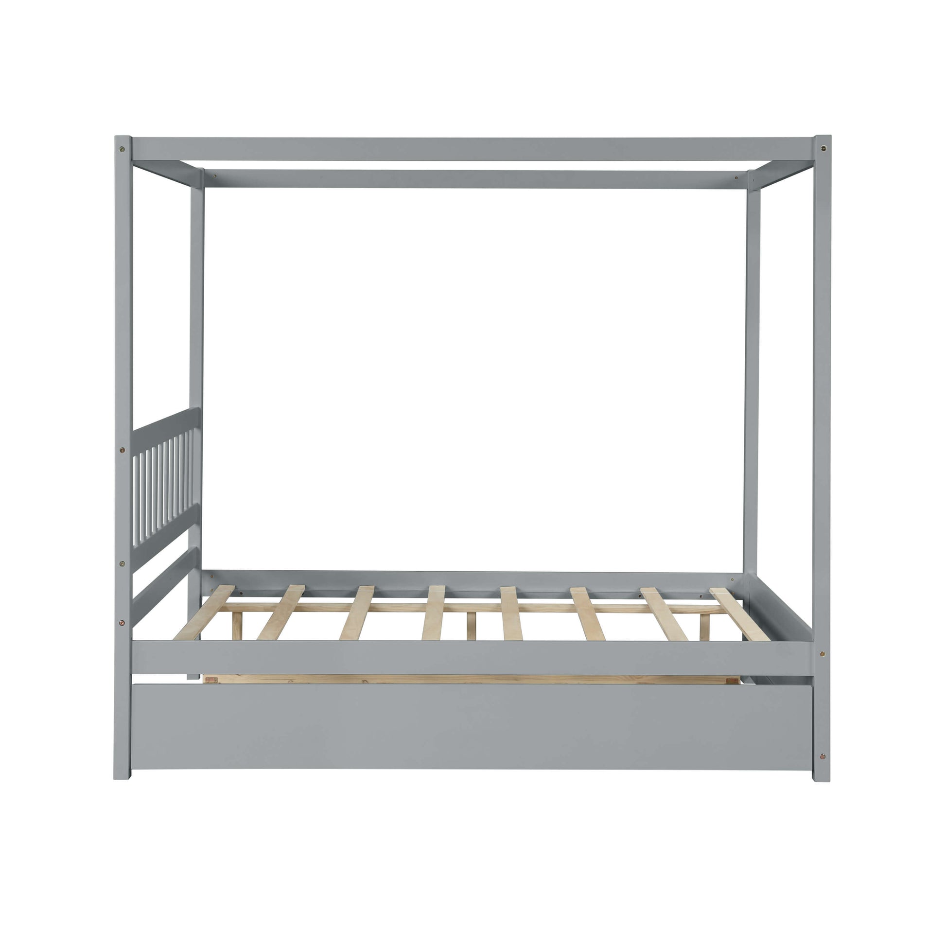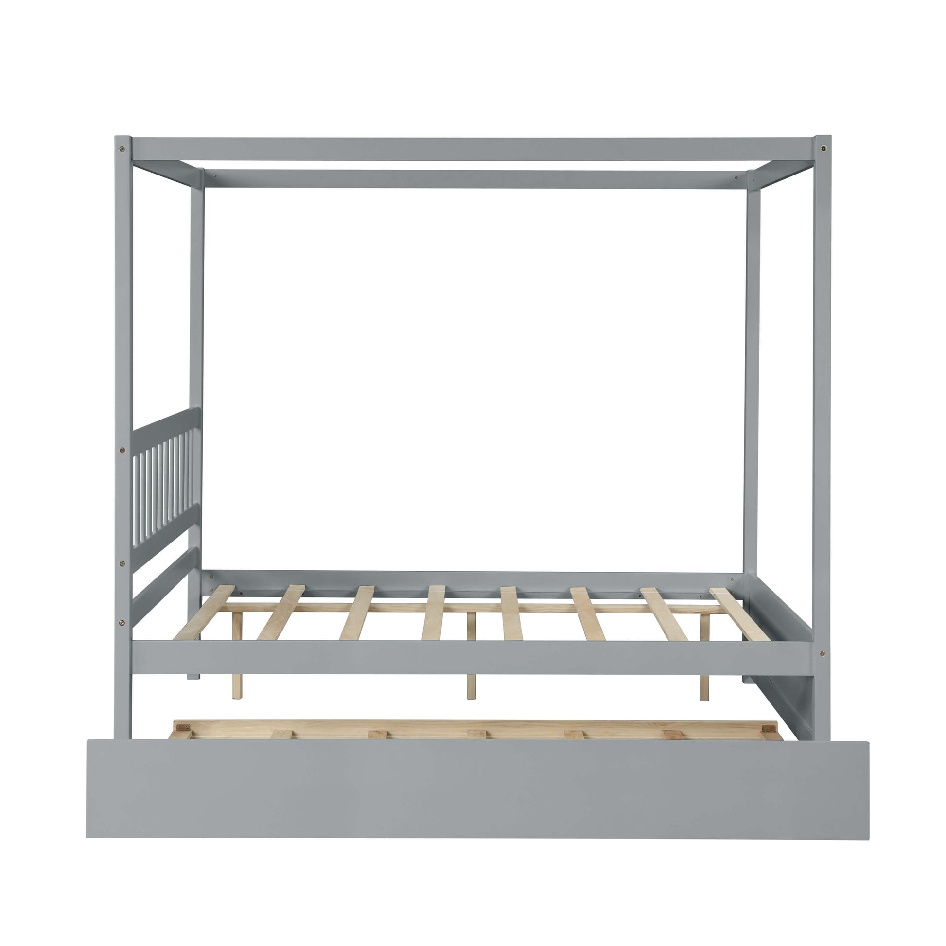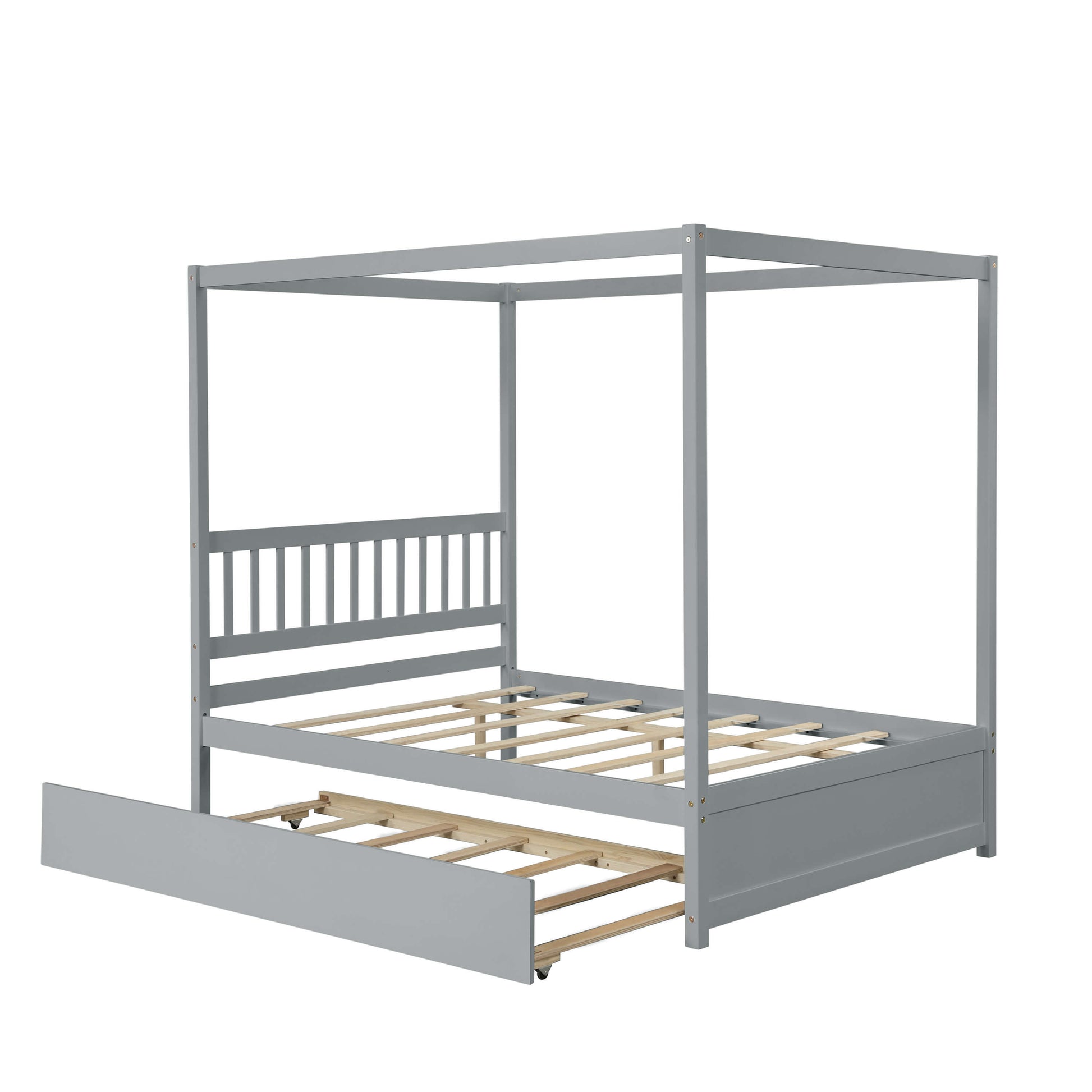 Full Size Canopy Bed With Twin Trundle, Kids Solid Wood Platform Bed Frame With Headboard, No Box Spring Needed Grey Color